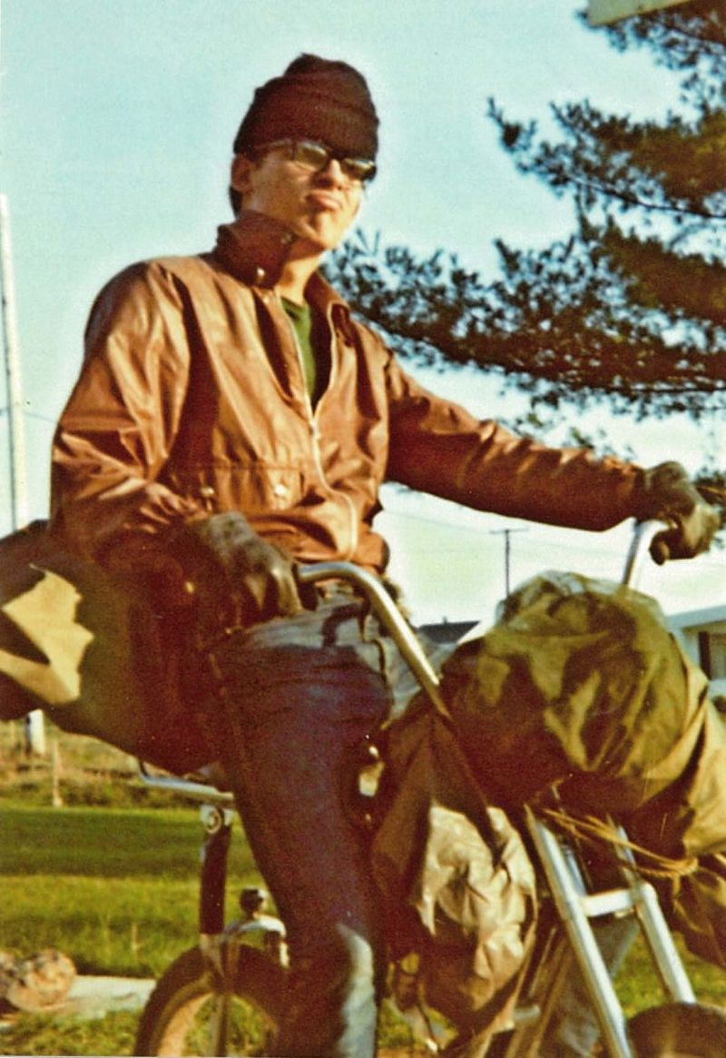 My name is Kim Leonard that is me in 1970 trying to look like Jim Bronson on my brother�s bicycle with my Dad's army duffel bags tied on the front and rear. I was 17 years old then, living in Maine.I wanted a motorcycle, but the weather that far north did not present a long riding season so I had to settle for a car. I wore my watch cap for three of the four years I was living in Maine. So it is safe to say that Then Came Bronson captured me at and early age. |
