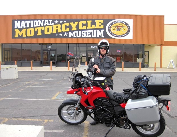 Jim heads out to ride that long lonesome highway on his red Bronson bike BMW.