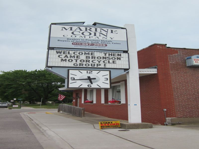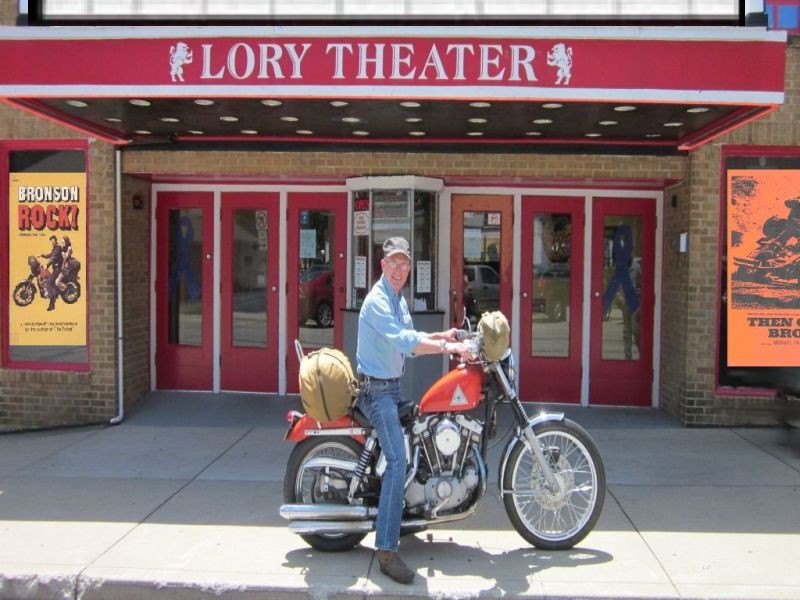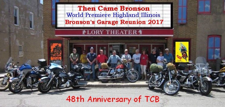 Very possibly for the first time ever the Pilot movie of Then Came Bronson was shown in a movie theater in the U.S.A. Bill Weder, charter member of Bronson's Garage, worked out a deal with the Lory Theater in Highland, Illinois to host the the World Premiere showing on Sunday, July 2nd. Following the movie event the 9th Reunion of Bronson's Garage was kicked-off in Marine Illinois at the Marine Coin Company at 6 PM.