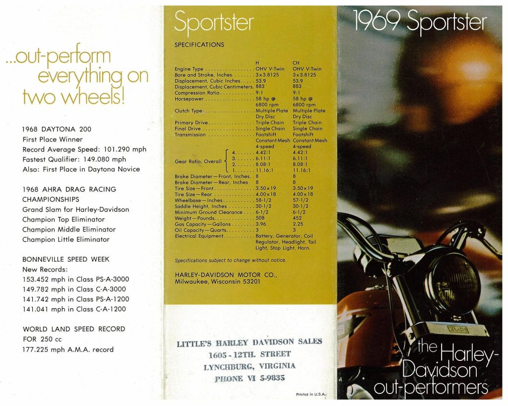 Vintage 1969 Harley-Davidson Sportster Brochure Page 1 of 4