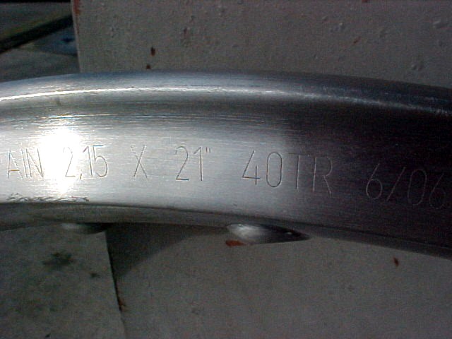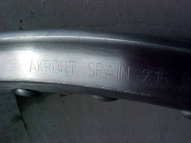 Should be lightly stamped "Akront Spain" also the size. Stainless steel spokes are from Buchanan's Spoke & Rim, Azusa, California. |