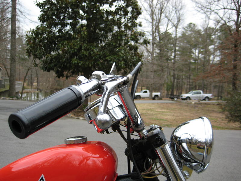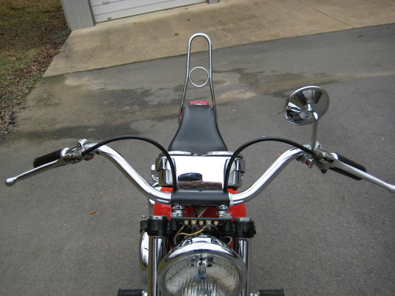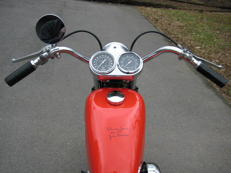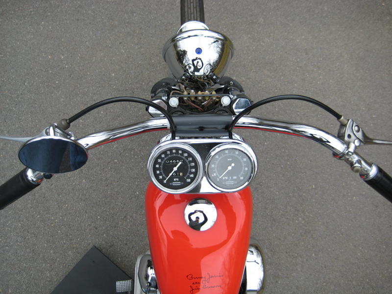 The handle bars are not the Buckhorn style you see here (left). You need a two piece item with and internal throttle cable and electrical wiring called Speedsters. You have a left and a right handle bar. This gives you a straighter alignment from left to right and perpendicular to the centerline of the bike. The pictures below are of Tom's Bike you can see the difference.Harley-Davidson catalog page with part numbers |