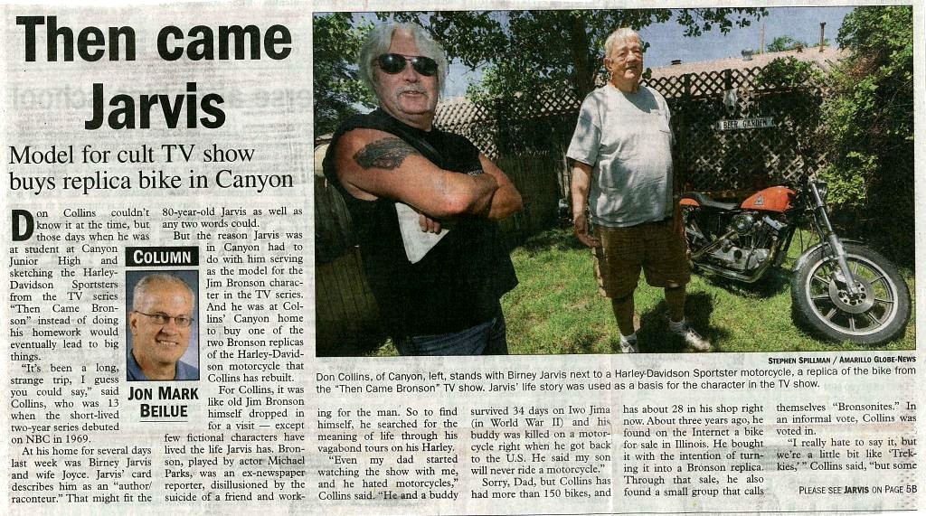 Both Bronsonites are headed for Jackson Hole Wyoming in a few days to attend the 2nd Annual Reunion of Bronson�s Garage. Jackson was the filming location site in 1969 for the first six episodes. Birney came through Canyon to pick up his Bronson Replica bike which Don built for him last spring. While in Canyon, the local wire service pick up on the fact that the real Jim Bronson was in town. Click on the news article pictures below to open a large scale picture so you can read the stories.