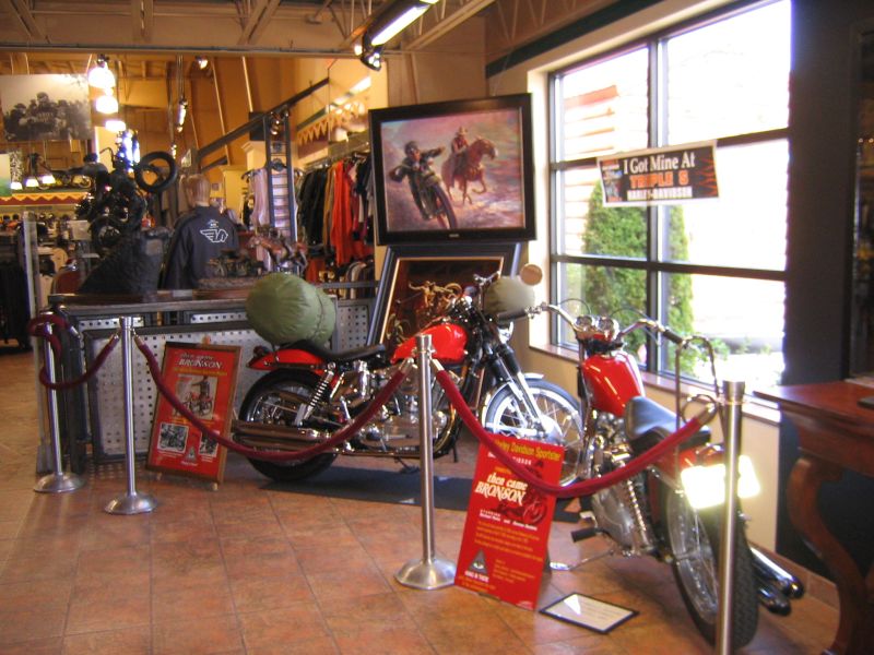 Greg (bike on the left) and Billy displayed their Bronson replica bikes at Triple S Harley-Davidson for one week prior to Mountain Fest 2009. Billy's custom made Harley-Davidson Sprint stunt bike was also in the display room. The Sprint was altered by Billy to replicate the stunt bike Bud Ekins used in making many of the jumps and racing scenes in the TV series. |