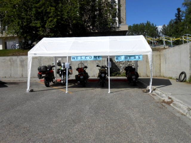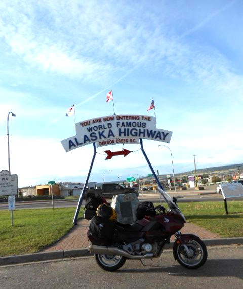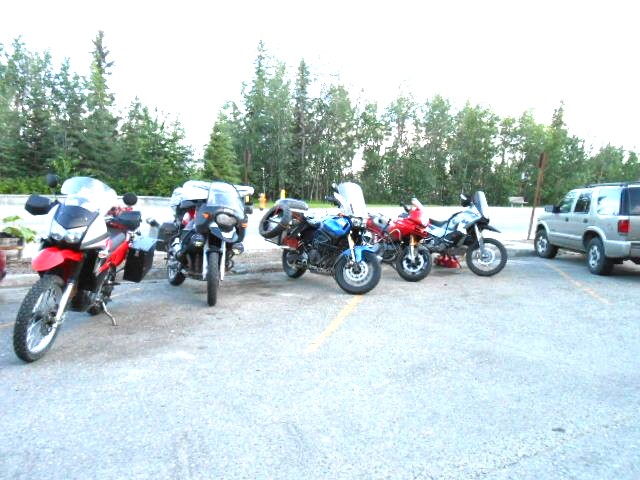 Made it to Dawson Creek, B.C., the beginning of the Alaskan Hwy. 1488 miles to Faribanks, AK. from here. Hope to be there on Friday. The Canadians are more aware of motorcyclist, note the photo of several signs I have seen on my travels. Speaking of riding in Canada, it is like a whole different country, they have their own language, it is called Metrics! Luckily my speedo has both MPH and KM/H. The max speed limit here is 100 KM/H or 62 MPH. Great riding again through the mountains, rain was not bad at all. |