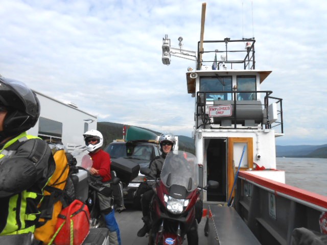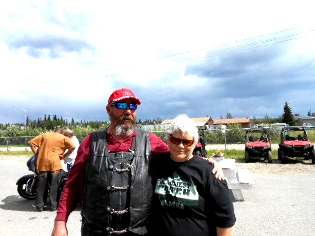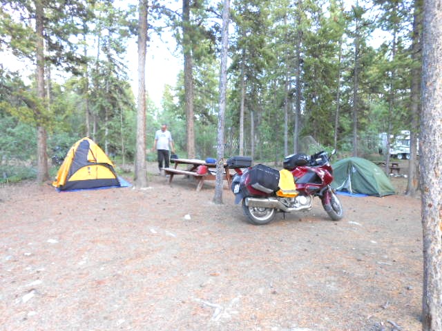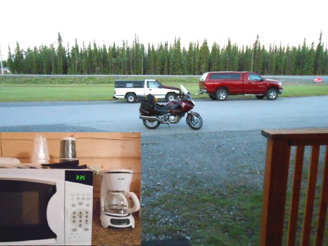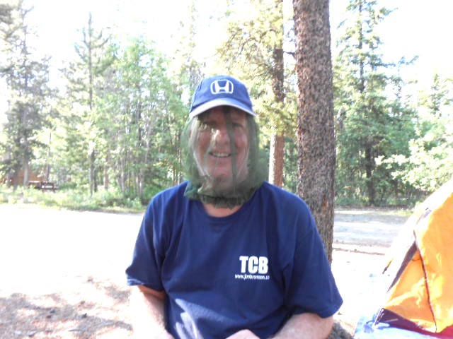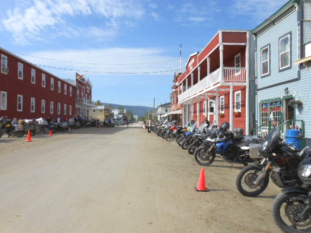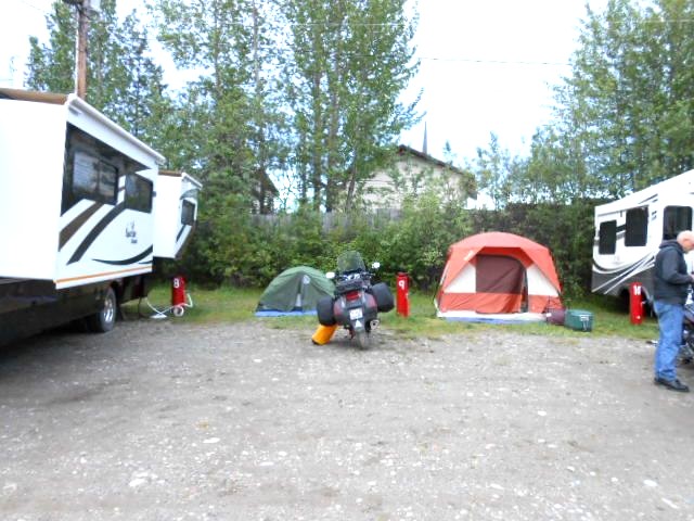 Spent the night in Tok, AK on Thursday night. Woke up at 3:30 AM and took a picture of my bike outside my cabin. Rode through the community of Chicken Alaska (no jokes please). Arrived at the Canadian border on the "Top of the World Highway" an hour and half before they were to open. Rode a ferry across the Yukon river to Dawson City, YT. to attend a motorcycle gathering called the D2D, Dust to Dawson. Over 300 riders showed up from all over on their adventure motorcycles. Camped in Dawson City and headed out this morning and came across Curt from New Hampshire on a Goldwing. We decided to ride together for the next few days as we leave Canada. Camping outside of Whitehorse tonight, with the mosquito's! |