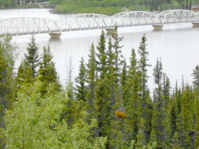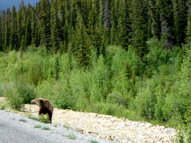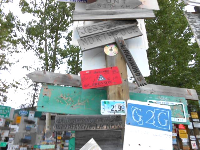 Woke up early in Watson Lake because I was camping in an RV park. Went to the gas station and had to wait for them to open. Walked across the street to the Signpost Forest which was started by homesick GI's back in 1942. Hung up our Bronson sign and then headed down that Long Lonesome - pot hole, wildlife infested, dirt, gravel, washboard, mud, wet, rainy, frost heave, RV, truckers, windy - Highway! It was actually pretty cool..and cold! Went across the Nisutlin Bay Bridge and through the village of Teslin. Stopped in Whitehorse for lunch and took a picture of a 1929 stern-wheeler, it is a boat. Later on I crossed Jarvis River, some where in the Yukon, made me think of Birney. Before the day was over I saw three more bears, (total of 13 so far) one black bear with a cub and one Grizzly. Stayed in Beaver Creek for the night, in a motel because it was raining, for a total of 554 miles. |