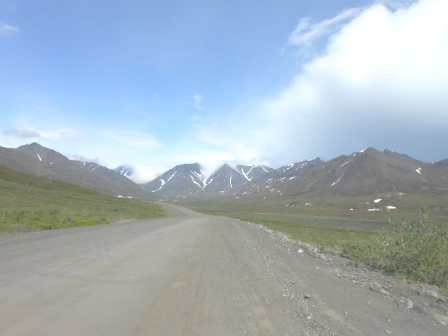 I left out on Sunday morning at 5:30 AM, rode to the Yukon River and got gas and had breakfast. Met Adam from San Francisco who was also going north and so we decided to ride together. Adam had the right tool, a BMW GS650. We headed north to the Article Circle and took pictures at the sign. Then north to about the half way point and the point of no return, the town of Coldfoot. Got gas and had lunch then headed north to Atigun pass. As we went up we noticed low clouds, that turned in to fog and rain, then it got a lot colder on the other side. The road to Prudhoe Bay parallels part of the Alaskan pipe line and consists of partly paved sections, gravel, mud, rocks, pebbles, half paved, half rocky, half dirt and all of these surfaces can occur with in a 100 ft section of road and then you can mix in some pot holes, dips, frost heaves, ruts and washboard, rocky, dirt, etc. etc. etc. The very cold rain made it all worse, and with a smooth street tread tire on the front of my bike, there were a lot of " Oh Poop" moments of almost dropping the bike in the mud. Same goes for the rocky sections with rocks the size of baseballs and golf balls. |