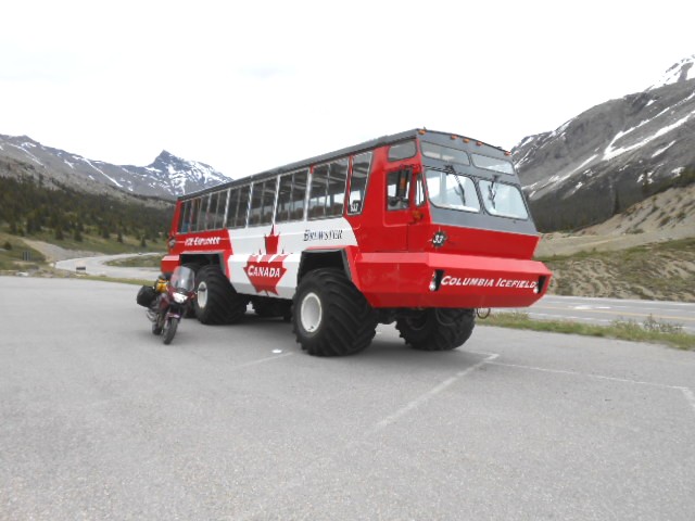 I decided I had enough time on the road and headed south on my own today. I left out of Houston, BC. and rode through Jasper and Banff National parks on Hwy 93. On the way I saw another bull moose, 4 bears, and 2 deer, also the coolest Canadian school bus that they use to drive around the ice fields in. Rode in rain and cold weather most of the day. It got really windy in southern Alberta and northern Montana. |