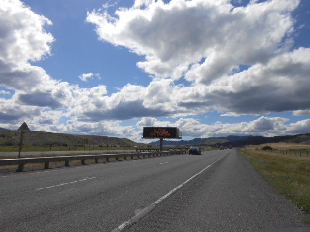 The sign on the highway (see picture) says "SEVERE CROSS WINDS USE CAUTION" Also, the posted speed limit in Montana is 75 mph, so what do I do, I go the speed limit. So what happens when you combine severe cross winds and ride at 75 to 80 mph, the answer is you use more gas. Yes, I ran out of gas just 12 miles from my intended gas stop, Bozeman, Montana. Luckily there was an off ramp and I coasted down and turned right. Then I pushed the bike about an 1/8 of a mile to a house. |