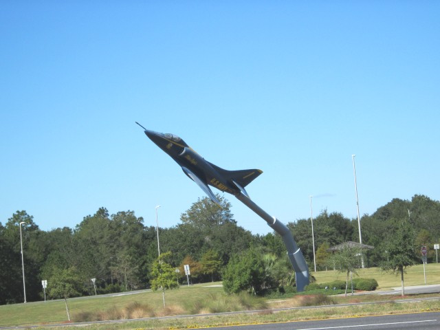 Woke up to a beautiful clear blue sky in the low 40's and headed for Bay Minette, AL. to see Joyce, she is the widow of the real Then Came Bronson, Birney Jarvis! Yesterday I accidentally gave her the impression I was going to come see her last night at 9:30 instead of this morning. She called me last night wondering where I was. I felt bad for the miss communication. I arrived at 9:10 AM and hung out for about a hour. She and her sister had important things to do and needed to head out to Gulf Port, I think she had a hot date with a slot machine! Headed south on Hwy 59 and then west on I-10 just past Pensacola where we stopped at a rest stop and took a picture of a Navy jet flying very low. We were fighting the wind for most of the day, note the flags blowing like crazy! Then we turned south on Hwy 19/27 and stopped for the night in Perry, Fl. Tomorrow we are going to Ocala to see Don Garlits drag race museum and then head south to where ever we end up. |