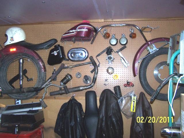 I set up a small air-conditioned shop area for the rebuild. To get all the parts out of the way, I hung them on what has become the Memorial Wall for my original bike. Note the helmet that Evel Knievel signed for me. I wore it on my first Bronson trip in 1974. |
