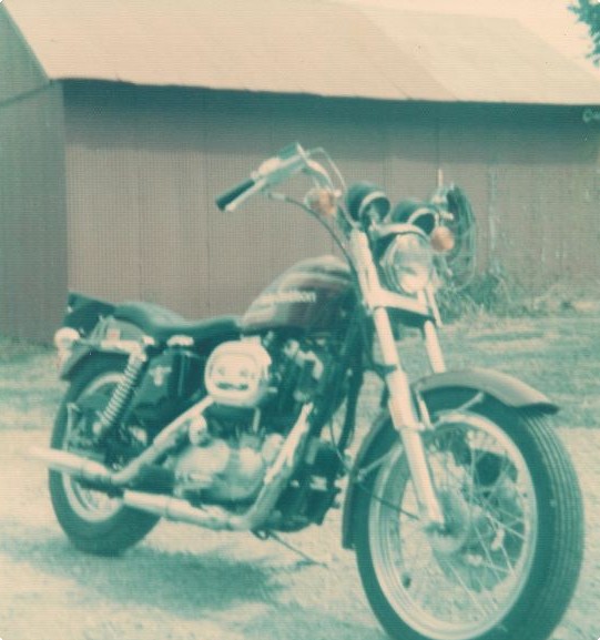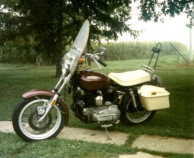 For a while, I rode it to work and everywhere in all seasons so it had to become a full-dresser. Note the Bronson Sissy Bar. My mom upholstered the little pad on the sissy bar and it has been on every bike I owned. |