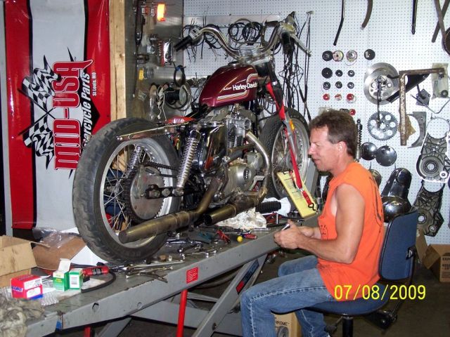 That is Jim at M & M Cycle setting up the engine for the first start-up after the rebuild |