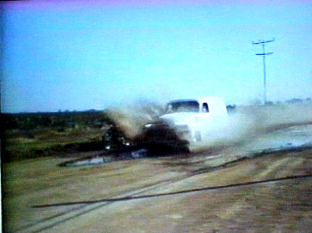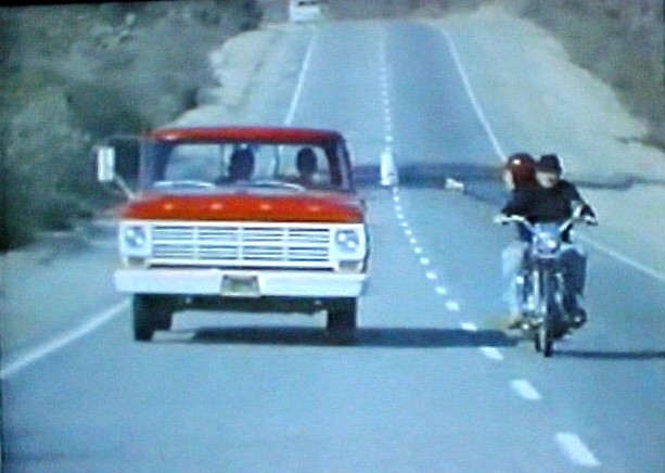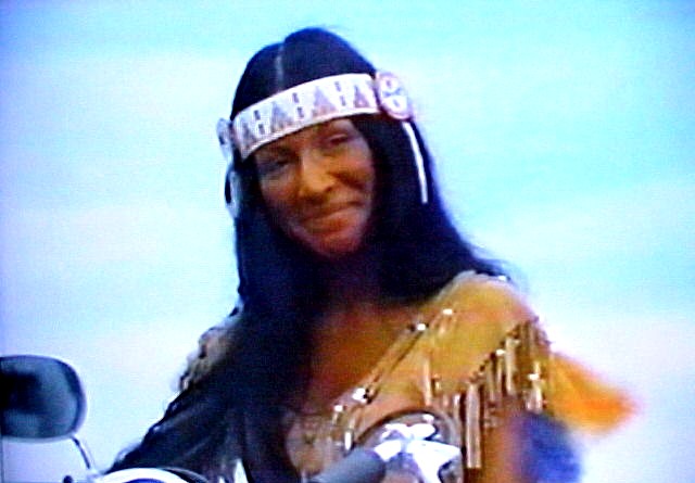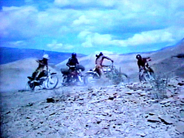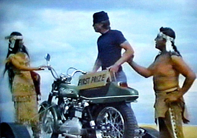 While driving down a lonely desert canyon road, Jim is attacked by Indians, complete with war paint, but they have traded in their horses for motorcycles. NOTE: The Boat-tail Sporty as first prize.