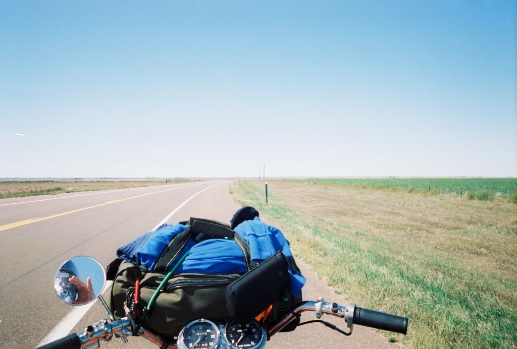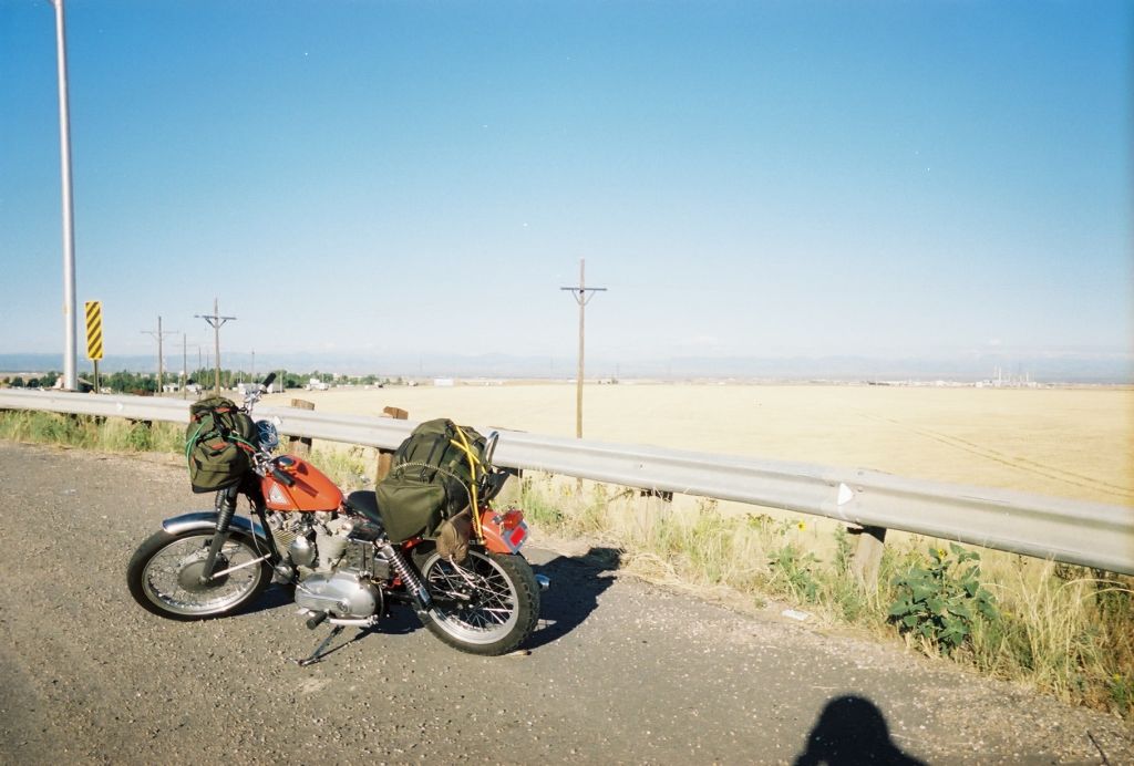 Leaving colorful Colorado, looking back towards Denver on Rt. 36. I had found two green duffel bags that resembled the ones used in the TV series and brought them from home and the only piece of clothing I had that matched what Bronson wore was a watch cap that I found in a surplus store in Boulder. It was a nice surprise when I found it since I was not looking for one. With an extra change of cloths, sleeping bag, tent, a coffee pot (like Bronson), I headed out into Denver's morning rush hour traffic. |