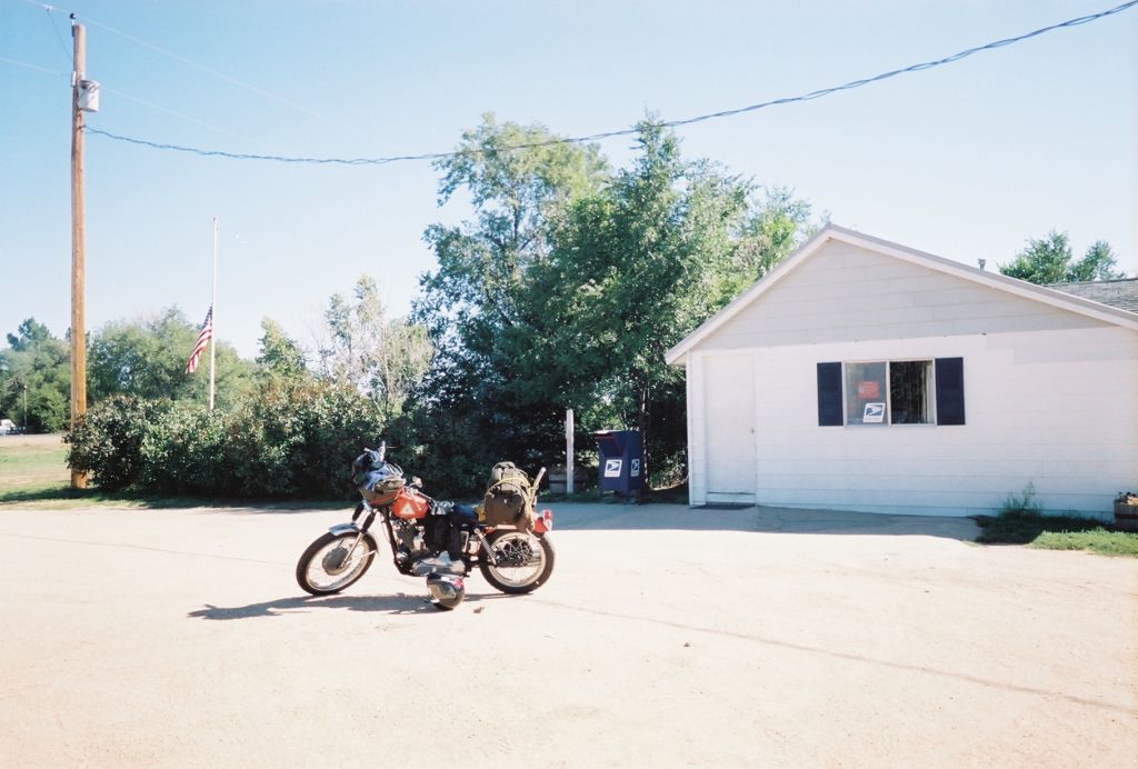 Lightening my load by mailing things home from this little post office in XXXXXX. The bike looked original but needed mechanical attention. It started easily but ran extremely rough, backfired a lot and really went through the gas. This was a 1974 the last of the right shift bikes. I had C.J.'s Hog Shop in Denver look it over since the Denver Harley Dealer could not work on anything older than 10 years old. After going through it and all tuned up, I stopped at a gas station along the way to fill up. A little gas got on the tank and it ate the paint right off! Oh well, it was way too orange anyway. |
