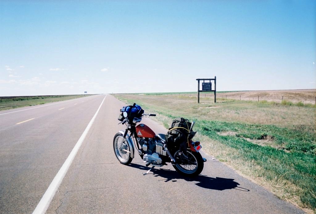 The view over the handle bars of the Long Lonesome Highway out of Denver. The day was clean and crisp, I felt like I was Jim Bronson, the sun felt like a spotlight. I pulled up my jacket zipper, released the clutch and slowed tacked up though the gears. In 1975 I did buy and AMF Sportster in a crate from a guy who had bought it as water damage goods out of Tennessee. It was brand new, I still have that bike as well as my replica in these pictures. Heading down the road the bike started backfiring and it got worse as it warmed up. |