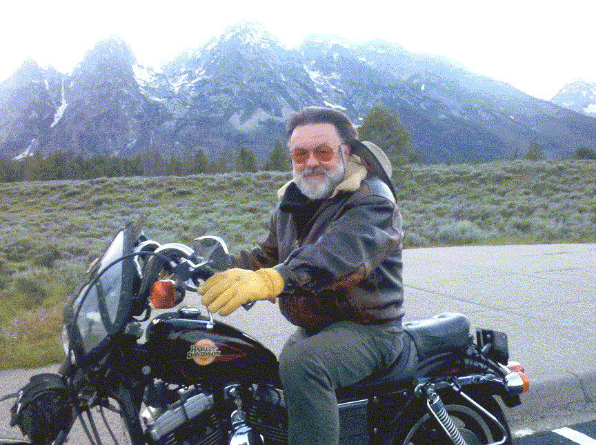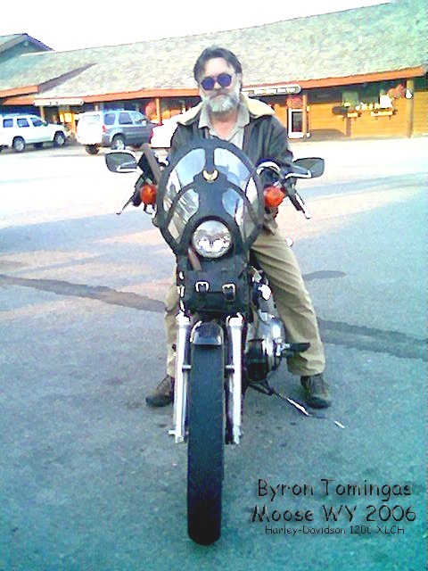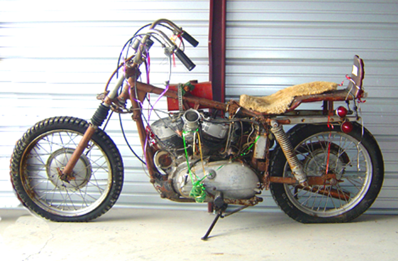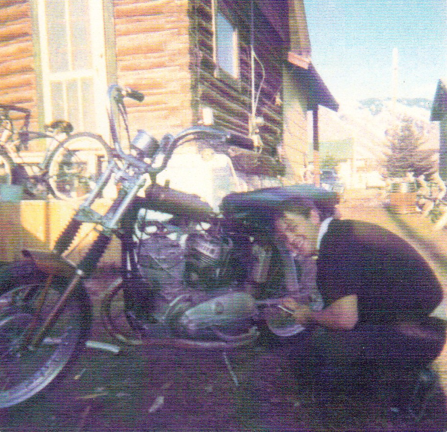 As you can see, in one of the pictures, I'm still riding a Sportster but this ones a 1200cc, and yes, I still have that old Flathead Sportster. You might see an odd carburetor, it is a big Mikuni pumper off a racing snow machine. The two small gas tanks were brass fire extinguishers that I converted.
