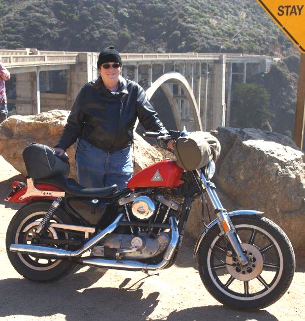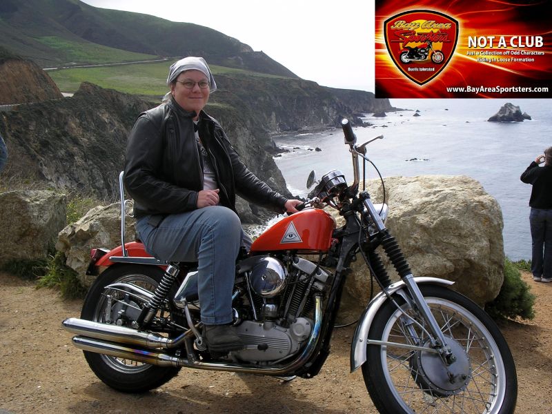 Diana at the 40th Anniversary ride at the Bixby Creek Bridge March 21, 2009. She sits on Don's Bronson Bike replica. |